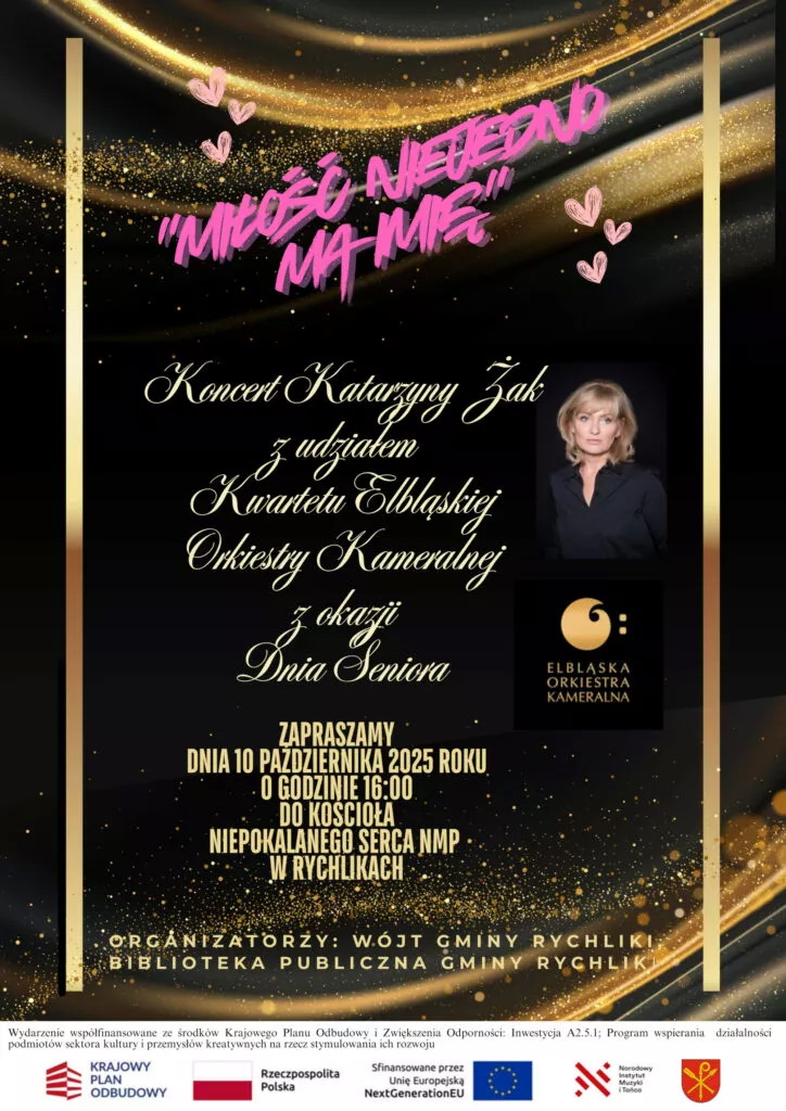 Wszystkich seniorów ale nie tylko, zapraszamy na koncert znanej aktorki Katarzyny Żak, która z towarzyszeniem Kwartetu Elbląskiej Orkiestry Kameralnej wystąpi w kościele parafialnym w Rychlikach już za dwa tygodnie, w piątek 10.10.2025 r. o godz. 16:00. Koncert odbędzie się z okazji Dnia Seniora.
